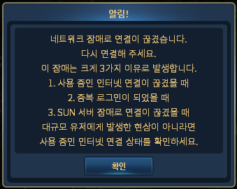 À§ ¾Ë¸²Ã¢ÀÌ Ãâ·ÂµÇ´Â °æ¿ì´Â °ÔÀÓ¿¡ ¿À·ù°¡ ¹ß»ýÇ߰ųª ½ã ¼¹ö¿¡ ÀÌ»óÀÌ ¹ß»ýÇÑ °ÍÀÌ ¾Æ´Ï¶ó °³ÀÎ ³×Æ®¿öÅ© Á¢¼Ó »óŰ¡ ºÒ·®Çϰųª Áߺ¹ ·Î±×ÀÎ µÈ °æ¿ìÀÌ´Ï, ³×Æ®¿öÅ© »óŸ¦ Á¡°ËÇϰųª Áߺ¹ ·Î±×ÀÎÀÎÁö¸¦ È®ÀÎÇϼ¼¿ä.